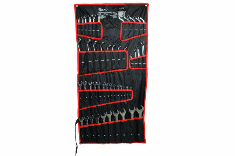 A termék leírása: Szatén kulcskészlet 47 részes. A kulcsok króm-vanádium acélból (CrV) készülnek. A kulcsok falra akasztható strapabíró tartóban vannak elhelyezve. A készlet tartalmaz kombikulcsokat, TORX gyűrűs kulcsokat, hajlított gyűrűs kulcsokat, C-típusú gyűrűs kulcsokat és félig nyitott villáskulcsokat. Műszaki adatok: Anyaga: króm-vanádium acél (CrV) Felüle
