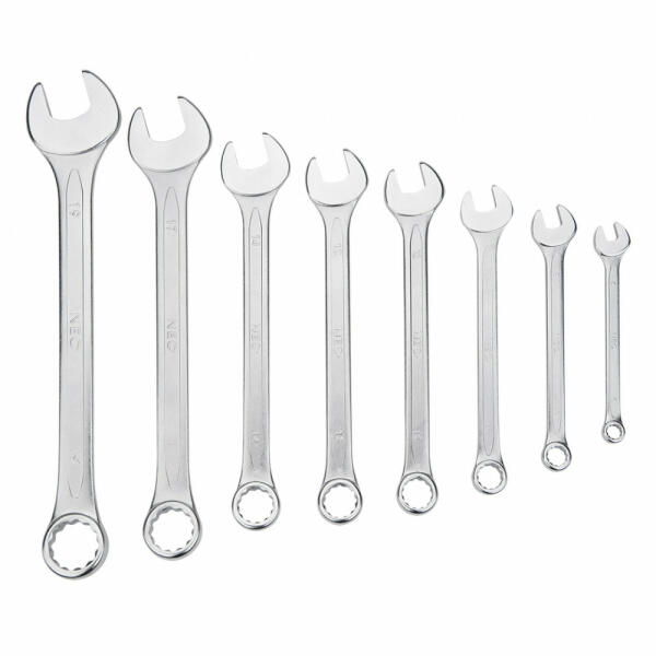 Neo csillag-villáskulcs készlet népszerű méretű kulcsokat tartalmaz, a kulcsok a DIN 3113 szabványnak megfelelően készülnek. A kiváló minőségű króm-vanádium acél sokéves tartósságot biztosít a kulcsoknak. A kulcsok praktikus, kulcsméreteket feltüntető tokba csomagoltak, ami megkönnyíti rendben tartásukat. A szerszám minőségét bizonyítja a TÜV tanúsítvány és a