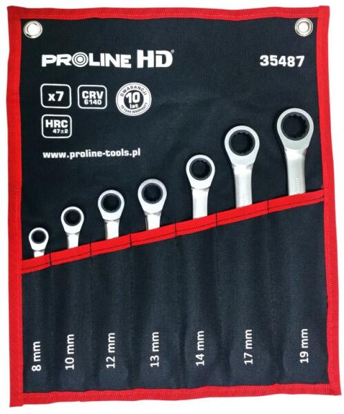 Anyag: kovácsolt, króm - vanádium acél Krómozott, sima felület Minimális munkaszög: 5 ° Tartós nylon szövet kiállító, kartondoboz kiszerelés 7 db-os készlet: 8, 10, 12, 13, 14, 17, 19 mm