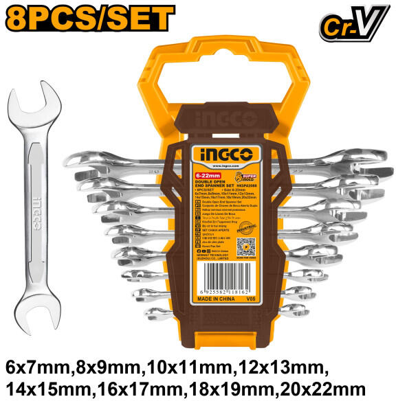 Méretek: 6 x 7 mm, 8 x 9 mm, 10 x 11 mm, 12 x 13 mm, , 14 x 15 mm, 16 x 17 mm, 18 x 19 mm, 20 x 22 mmPolírozott Szállítási terjedelem: 8 db villáskulcs, Műanyag akasztó