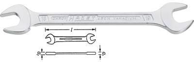 Kettős villáskulcs, laptáv: 14 mm, laptáv: 15 mm Erőteljes igénybevételhez · Karcsú fejjel · Kettős T Profil, különösen stabil szárral · Króm-vanádium · Felület: krómozott · DIN 3110, ISO 10102 Műszaki adatok: Kulcstávolság: 14 x 15 mm