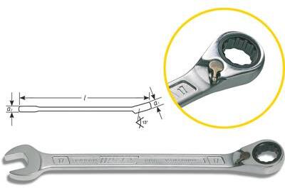 Racsnis gyűrűs villáskulcs Nehezen hozzáférhető csavarkötések lazításához, meghúzásához igen szűk helyen, a csavarfejen fogásváltás nélkül a racsni funkcióval · Gyűrűskulcs, átkapcsolható racsni funkcióval · Finom fogazással, 72 foggal, forgatási szög 5° · Gyűrűs oldal 13°-os szög alatt áll · Króm-vanádium · Felület: krómozott Műszaki adatok: Kulcstávo