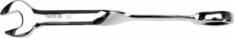 YATO YT-01880 18 mm-es racsnis gyűrűs csavarkulcs, egyik oldalán racsnival, másik oldalán lapos véggel. Ergonomikus csavart alakja megkönnyíti a munkát és nagy kényelmet biztosít, különösen erősen megragadt csavarok esetén. - a 90°-os csavart markolat tökéletesen illeszkedik a kézhez, így a csavarok meghúzásakor nagyobb nyomást ad át a kulcsra, kevésbé terheli a felhasz