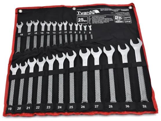 Professzionális TVARDY márkájú csillag-villás kulcs készlet. A készlet 25 darab kulcsot tartalmaz 6-32 mm-es méretekben , valamint egy erős vászont , amely megerősített lyukakkal rendelkezik, így felakasztható a falra . Kiváló minőségű, hidegen kovácsolt CRV szerszámacélból készült . A kulcsok alapos hőkezelési folyamaton mentek keresztül . Vákuumkemencében edzettek