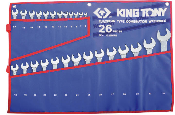 King Tony csillag-villás kulcs készlet jellemzői 14 db-os készlet Méretek: 1060: 6; 7; 8; 9; 10; 11; 12; 13; 14; 15; 16; 17; 18; 19 mm Króm-vanádium ötvözött acél Krómozott felület A csavarkulcs készlet vászon - műbőr tartóban Súly: 1,24 kg