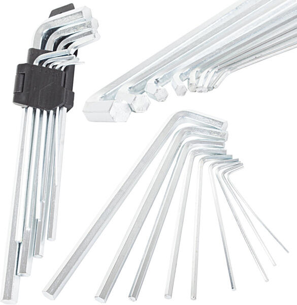 Króm-vanádium CR-V imbuszkulcs készlet. - robusztus kivitel - méretek: 1.5-2. -2.5-3-4-5-6-8-10mm - univerzális - króm-vanádium - imbusz fej Praktikus és könnyen felakasztható tartóban érkezik ez az imbusz készlet. Kiváló minőségű, tartós acélból készült, gondosan megmunkált fejekkel. A készletben található kulcsok mérete ( az 'a' és 'b' méreteket ld. a rajzon jelölv