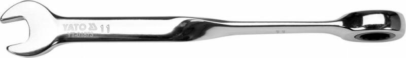 YATO YT-01873 11 mm-es racsnis gyűrűs kulcs, egyik oldalán racsnival, másik oldalán lapos véggel. Ergonomikus csavart alakja megkönnyíti a munkát és nagy kényelmet biztosít, különösen erősen megragadt csavarok esetén. - a 90°-os csavart markolat tökéletesen illeszkedik a kézhez, így a csavarok meghúzásakor nagyobb nyomást ad át a kulcsra, kevésbé terheli a felhasználó