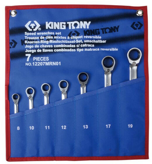 King Tony csillag villáskulcs készlet tartalma Racsnis csillag-villáskulcsok: 3732: 10 11 12 14 15 17 19 mm Vászon tartóban Az irányváltós racsnis csillag villáskulcs jellemzői A King Tony racsnis csillag-villás kulcs króm-vanádium acélból készül, a racsni anyaga S2 acél. irányváltós