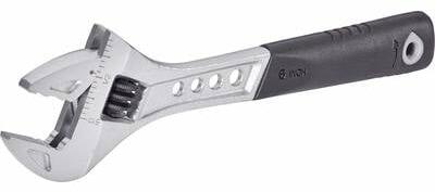 Görgős villáskulcs Mart pofák Többrétegű matt krómozás Univerzális kulcs, a hagyományos görgős villáskulcsnál 18%-kal nagyobb nyílással. Jellemzők: Edzett, szoft fogantyúval · mm-skálával · Mart pofákkal, többrétegű matt krómozással. Műszaki adatok: Anyag: Króm-vanádium acél · Csavarkulcs típus: Állítható villáskulcs · Kulcsszélesség: 25 mm · Méret, hoss