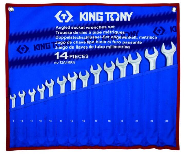 King Tony ultra könnyű csillag villáskulcs készlet Méretek: 8 , 10 , 11 , 12 , 13 , 14 , 15 , 16 , 17 , 18 , 19 , 21 , 22 , 24 mm Vászon tartóban Súly: 2,44 kg Európai vékony típus 15 °-os szögű villás vég 13 °-ban hajlított csillag fej Króm-vanádium ötvözött acélból Krómozott felület Metrikus méret -DIN3113/ISO7738 King Tony ultra könnyű csillag villáskulcs készlet