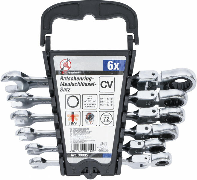 Méretek: 1/4", 5/16", 3/8", 7/16", 1/2", 9/16" 180°-ban hajló csuklós csillagkulcs fej. 72-fogú racsniszerkezet, 5°-onként állítható. Felület: krómozott, magasfényű Anyag: Carbon-Stahl (CR40) Bruttó súly: 540 g