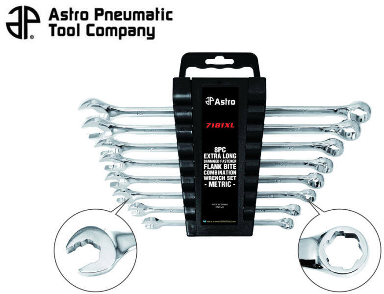 Astro 8 részes extra hosszú csillag-villás kulcs készlet sérült csavarok leszedésére. Speciális kialakítású, hosszú csillag-villás kulcs készlet mely kíválóan alkalmas a rászorult csavarok lazításához/meghúzásához, valamint a nehezen megfogható, megrongálódott csavarok, anyák leszedéséhez. Speciális fejkialakításának köszönhetően még egy 90%-osan lesarkított