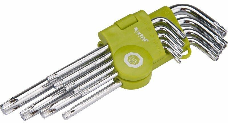 Hosszított torx - lyukas torx kulcs készlet, CrV T10-T50 A 9 darabos hosszított kulcs készlet jó minőségű CrV acél (króm-vanádium) alapanyagból készült. A kulcsok L-alakja biztosítja a kifejtett erő optimális kihasználását és elősegíti a könnyű és egyszerű munkavégzést. Méretek: Hosszabb száron (torx TX): TX 10 TX 15 TX 20 TX 25 TX 27 TX 30 TX 40 TX 45 TX 50 Rövideb