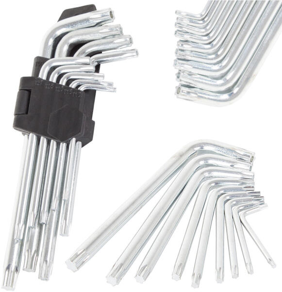 Torx fejű imbuszkulcs készlet. - robusztus kivitel - méretek: 1.5-2. -2.5-3-4-5-6-8-10mm - univerzális - króm-vanádium - torx fej Praktikus és könnyen felakasztható tartóban érkezik egy a torx fejű imbusz készlet. Kiváló minőségű, tartós acélból készült, gondosan megmunkált fejekkel. A hosszú száraknak köszönhetően a nehezen elérhető helyeken is használhatóak. A k