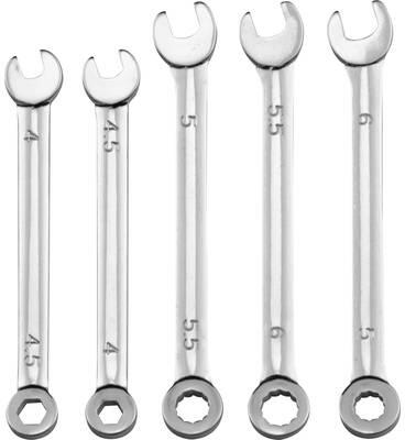 Mini gyűrűs-villáskulcs készlet, 4 - 6 mm, 5 részes, Donau Elektronik 920 Mini gyűrűs-villáskulcs készlet, 4 - 6 mm, 5 részes, Donau Elektronik 920 Műszaki adatok: Anyagjellemző: Krómozott · Kulcsszélesség: 4 mm, 4.5 mm, 5 mm, 5.5 mm, 6 mm · Mennyiség megadása: 5 részes · További műszaki adatok: A fej a villáskulcs oldalon 15°-ban hajlított, a gyűrűskulcs oldalon egyene