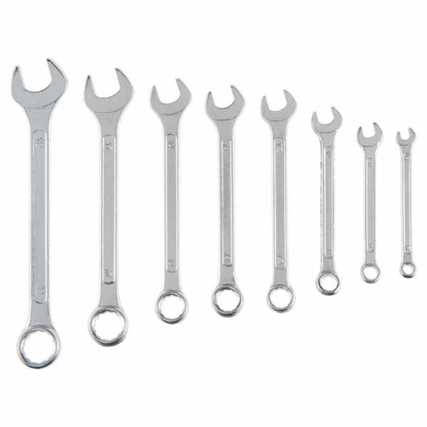 Csillag-villáskulcs kllt. 8 db, 8-17 mm, acél, 15°-os szögben hajlított fej, Tizenkétszögű kialakítású, méretek: 6, 8, 10, 12, 13, 14, 17, 19 mm