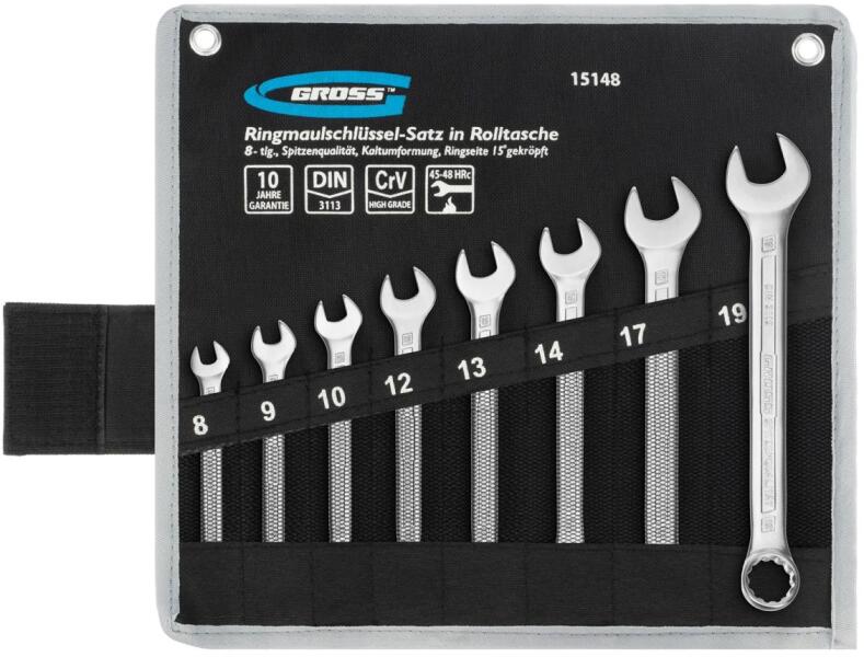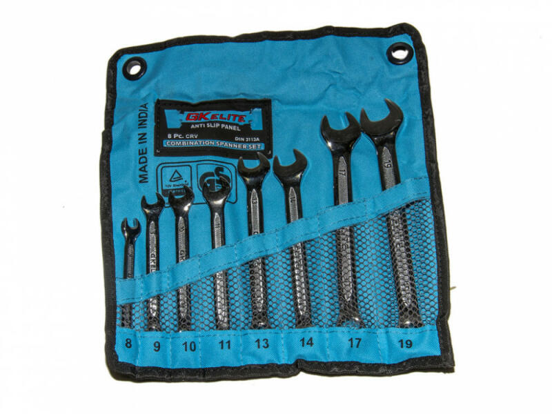 GK-Elite Csillag-villáskulcs készlet 8 darabos kiszerelésben, falra akasztható fali szövet tárolóban. Tulajdonságok: Anyag: Edzett és hőkezelt króm-vanádium acél. Recézett, dombornyomásos szár a csúszásmentes fogásért. Egyenes-szárú, mindkét vége 15°-kal hajlított (villás vége horizontálisan, csillag vége vertikálisan). Teljes felülete fényesre polírozott. Hosszú
