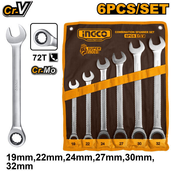 Méretek: 19, 22, 24, 27, 30, 32 mm Polírozott, CrV Szállítási terjedelem: 6 db racsnis csillag-villáskulcs, Vászon táska csomagolás