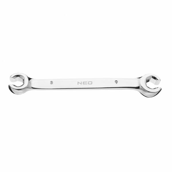 Neo félnyitott csillagkulcs pneumatika, hidraulika és üzemanyag vezetékek oldásához. Kiváló minőségű króm-vanádium acélból, kovácsolással készül, hosszú élettartam jellemzi. A 15°-ban elhajlított csillagkulcs megkönnyíti a munkát a nehezen hozzáférhető helyeken. A szerszám minőségét bizonyítja a TÜV tanúsítvány és a gyártó által nyújtott 25 éves jótáll