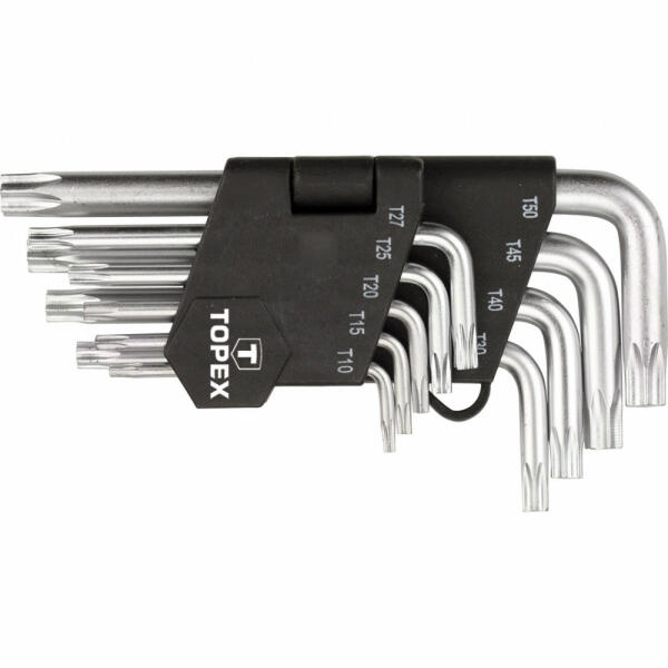 A Topex rövid Torx kulcsok nagy ellenállóképességű, a terméknek hosszú élettartamot biztosító króm-vanádium acélból készülnek. A praktikus, mindegyik kulcsnak külön megjelölt rekesszel rendelkező műanyag tok megkönnyíti a tárolásukat. A Topex márka ezermestereknek készül. Torx kulcs készlet 9 db?os, T10-T50, hosszú, CrV acél, méretek: T10, T15, T20, T25, T27, T30,