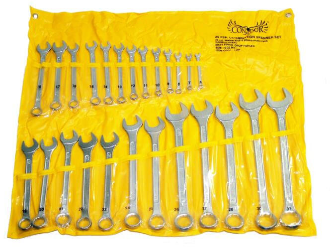 A termék leírása: Polírozott kombikulcs készlet, 25 darab. A kulcsok hidegen kovácsolt, edzett és temperált, króm védőbevonattal borítottak DIN3110 szabvány szerint. Korrózió ellen védett. Méretek: 6,7, 8,9, 10,11, 12,13, 14,15, 16,17, 18,19, 20,21, 22,23, 24,25, 26,27, 28,30, 32 mm