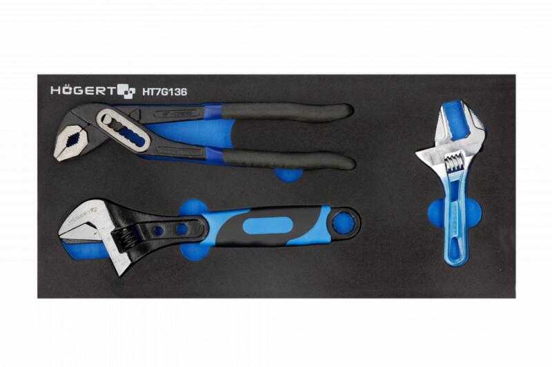 HT1P560 és HT1P562 villáskulcs, HT1P372 fogó; kiváló minőségű CrV ötvözött acélból készült; technikai hab.