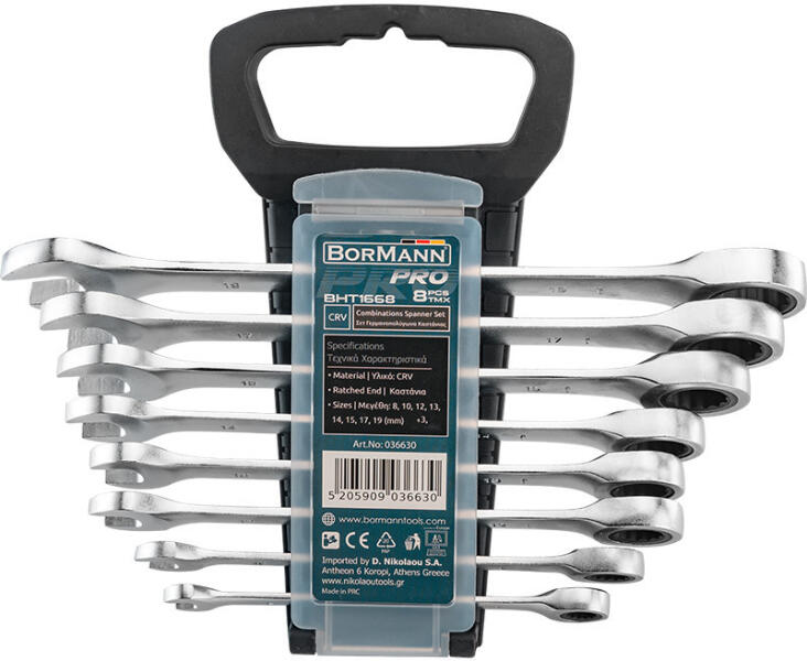 Racsnis csillag villáskulcs készlet a Bormann Pro-tól Króm-vanádium anyagból, domború kivitelben Méretek (mm): 8, 10, 12, 15, 17, 19