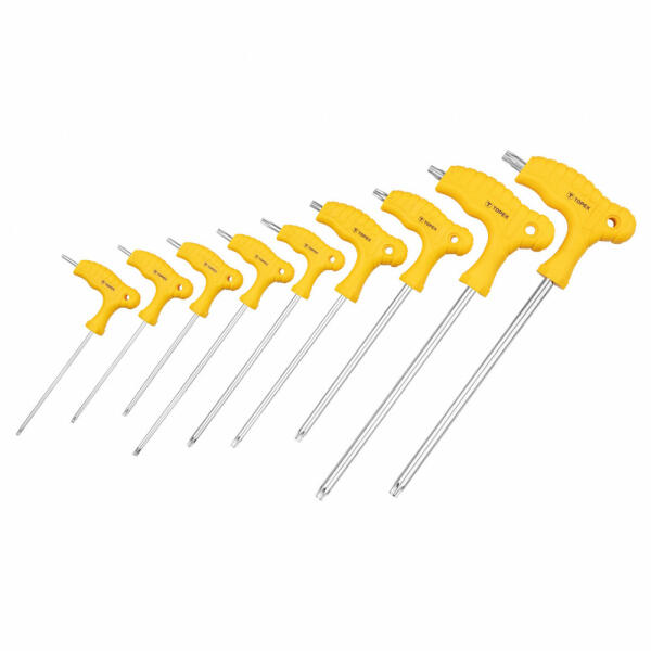A Topex Torx kulcskészletben 9 db T-szárú kulcs kapott helyet. Nagy ellenállóképességű, a terméknek hosszú élettartamot biztosító króm-vanádium acélból készülnek. Az ergonómikus műanyag markolatok biztosítják a munkavégzés kényelmét. A Topex márka ezermestereknek készül. Torx kulcs készlet 9 db?os, T10-T50, méretek: T10, T15, T20, T25, T27, T30, T40, T45, T50, CrV a
