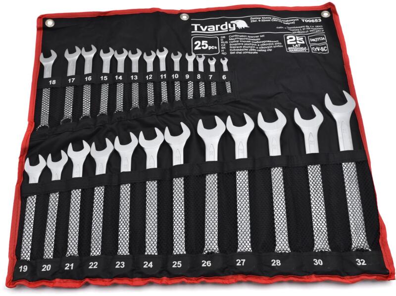 Csillag-villáskulcs készlet, falra akasztható 25 db 6 – 32 mm HQMinőségi csillag-villáskulcs készlet króm-vanádium acélból. A kulcsok praktikus nylon csomagolásban vannak tárolva az egyszerű áthelyezés és tárolás vagy felfüggesztés érdekében a műhely, szerviz vagy garázs falára. Méretek: 6, 7, 8, 9, 10, 11, 12, 13, 14, 15, 16, 17, 18, 19, 20, 21, 22, 23, 24, 25, 26, 27