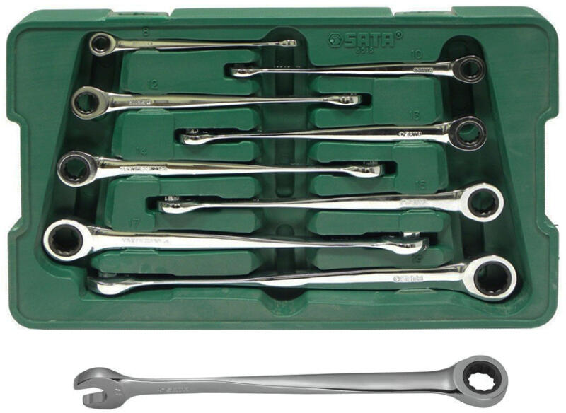 SATA 8 részes prémium minőségű racsnis csillag-villás kulcskészlet, ipari használatra is. A szerszám két vége 90 fokos szöget zár be egymással a speciális kovácsolásnak köszönhetően. A markolat rész vastagabb, erősebb kialakítású, mint a hagyományos kulcsoknál! Hosszúság: 25 %-kal hosszabb, mint a normál csillag-villás kulcsok, így könnyebb a hozzáférés a neheze