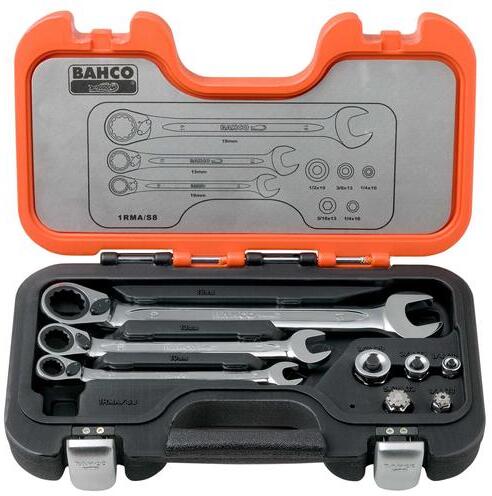 Racsniskulcs adapter és racsnis csillag-villáskulcs készlet. ISO 3318 / DIN 3113 és ISO 1174 / DIN 3120. Felület: nikkel és króm bevonat, polírozott. . Anyaga: CrV. 1RM-10 , -13, -19-es kulcs, 5°-os működéssel, 15°-ban hajlított fejjel. Adapterek 1/4", 3/8" és 1/2"-os dogókulcsokhoz, gyorskioldóval. 1/4"-os, 5/16"-os adapter bitekhez. Műanyag dobozban (HDPE). High performance all