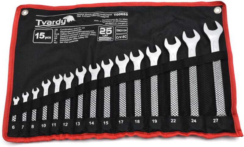 Professzionális TVARDY márkájú csillag-villás kulcs készlet. A készlet 15 darab kulcsot tartalmaz 6-27 mm-es méretekben , valamint egy erős vászont , amely megerősített lyukakkal rendelkezik, így felakasztható a falra . Kiváló minőségű, hidegen kovácsolt CRV szerszámacélból készült . A kulcsok alapos hőkezelési folyamaton mentek keresztül . Vákuumkemencében edzettek
