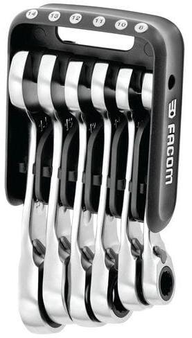 Kulcskészlet 15°-os szögben döntött fejjel az oldalsó hozzáférés és a jó hozzáférhetőség érdekében. Csúszásmentes villáskulcsok a jó tapadáshoz az anyához és a sérülések megelőzéséhez. Változtatható keresztmetszetű fogantyúk a kéz támasztófelületének megduplázásához. A tok laposan kinyílik a kulcs azonnali azonosításához. Kulcsok kiváló markolattal a