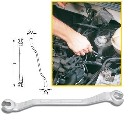 Nyitott, kettős csillagkulcs Jellemzők: Fékvezetékek csavarmenetes kötéseihez · Megerősített kivitel · Hajlított · Hatlapú · Egyenesen felhasítva · Króm-vanádium · Felület: krómozott Műszaki adatok: Kulcstávolság: 11 x 13 mm · Méret, hossz: 184 mm