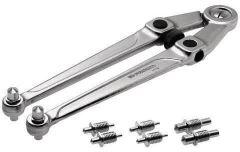 Felső lyukakkal rendelkező anyákhoz. A kulcsot a középső csavarra hatva körzőként lehet beállítani. Kivehető dupla és kerek szemek. Minden kulcshoz négy darab két tű tartozik. Kapacitás: 20-100 mm. Hossz: 245 mm. Szatén króm bevonat. Súly: 0,530 kg.