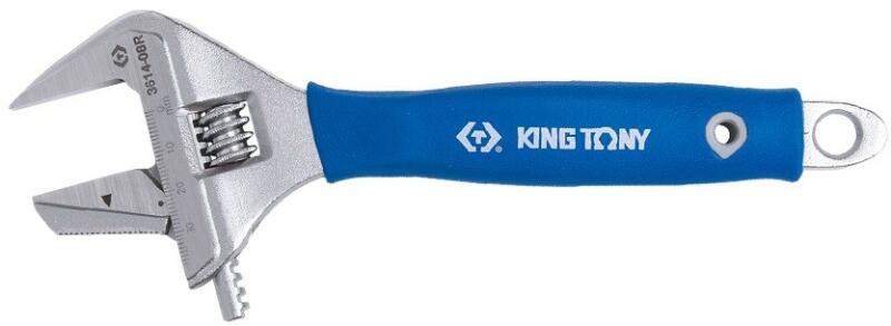 King Tony állítható villáskulcs 200mm Megfordítható pofa, egyik oldalon sima, másik oldalon finoman fogazott Széles pofanyílás Hossz L: 212 mm Méret tartomány: 0 - 38 mm Pofaszélesség H1: 5,7 mm H2: 13,9 mm A: 69 mm E: 32,4 mm 30%-kal hosszabb pofák, mint a hagyományos állítható kulcsok Anyaga: króm-vanádium ötvözött acél A kétfunkciós széles pofák állítható csavark