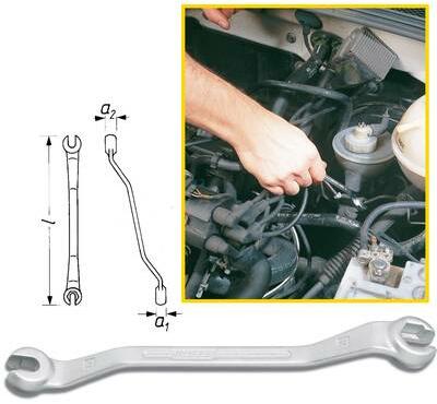 Nyitott, kettős csillagkulcs Jellemzők: Fékvezetékek csavarmenetes kötéseihez · Megerősített kivitel · Hajlított · Hatlapú · Egyenesen felhasítva · Króm-vanádium · Felület: krómozott Műszaki adatok: Kulcstávolság: 10 x 11 mm · Méret, hossz: 168 mm