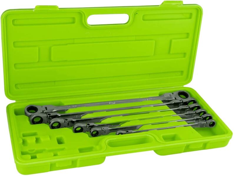 Leírás A csuklós végek kiválóan alkalmasak a mélyen elhelyezkedő anyák és csavarok különböző szögekből való elérésére. A 72 fogú racsnis mechanizmus biztosítja, hogy egy min. 5°-os elforgatás elegendő az anya rögzítéséhez vagy meglazításához. Praktikus kofferban kapható. Tartalom 1db 8x9mm 1db 10x11mm 1db 12x13mm 1db 14x15mm 1db 16x18mm 1db 17x19mm