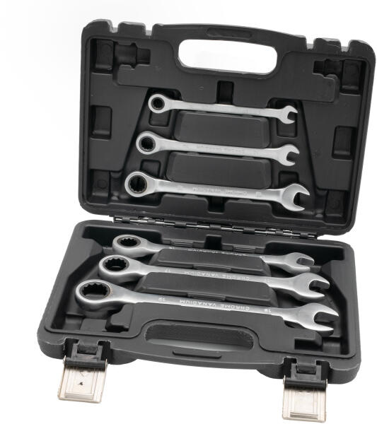 Leírás A készlet 6 db racsnis villáskulcsot tartalmaz, amelyek még a nehezen elérhető helyeken is megkönnyítik a munkát. A szerszámok tartós és ellenálló króm-vanádium acélból készültek. Biztonságosan tárolhatóak és szállíthatóak a szerszámokhoz mellékelt erős műanyag kofferban. Tartalom Praktikus műanyag koffer 6db racsnis villáskulcs a következő méretekkel: 8