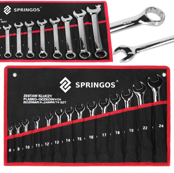 ALAPADATOKMárka: Springos®Szín: fekete és pirosAnyag: acél, szintetikus szövetA készlet a következőket tartalmazza: 14 kulcs + 1 tokÖsszehajtogatott tok méretei: tekercs 33 x kb. 8 cmA széthajtott tok méretei: méret: 50 x 33 cm8 - 24 mm méretű kombinált kulcskészlet / 14 db. További információk:Puha szövetből készült tok, feltekerve, a megkötéshez való megkötéssel és