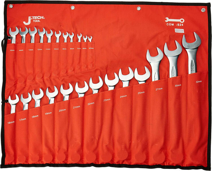 24 részes csillag-villáskulcs készlet. A hőkezelt Cr-Va ötvözött acél biztosítja a tartósságot és a korrózióállóságot. A 12-szögű csillag fejek jól illeszkednek a csavarfejekre és anyákra, ezáltal elkerülhető azok kopása és sérülése. Kulcsméretek: 5.5, 6, 7, 8, 9, 10, 11, 12, 13, 14, 15, 16, 17, 18, 19, 20, 21, 22, 23, 24, 25, 27, 30, 32 mm