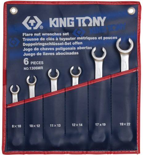 King Tony fékcsőkulcs készlet adatai Tartalma: 8x10mm, 10x12mm, 11x13mm, 12x14mm, 17x19mm, 19x22mm Vászon - műbőr tartóban. King Tony fékcsőkulcs jellemzői 6 szögű kulcsfejjel 12 °-ban hajlított csillag fej Króm-vanádium ötvözött acélból Krómozott felületű csavarkulcs Metrikus méret - DIN 3118 szabvány szerit
