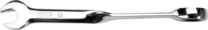 YATO YT-01872 10 mm-es racsnis gyűrűs csavarkulcs, egyik oldalán racsnival, másik oldalán lapos véggel. Ergonomikus csavart alakja megkönnyíti a munkát és nagy kényelmet biztosít, különösen erősen megragadt csavarok esetén. - a 90°-os csavart markolat tökéletesen illeszkedik a kézhez, így a csavarok meghúzásakor nagyobb nyomást ad át a kulcsra, kevésbé terheli a felhasz