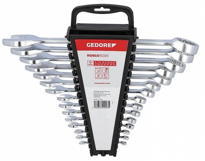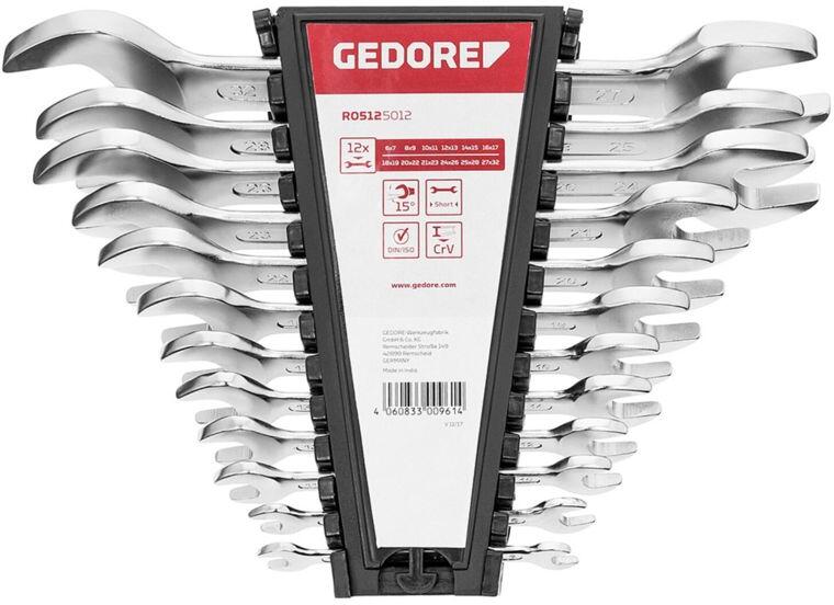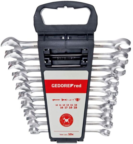 A GEDORE Red R05905010 nyitott végű racsnis kulcskészlete 10 darab, mindkét oldalon azonos kulcsszélességű racsnis kulcsot tartalmaz egy tartóban. A nyitott gyűrű oldala 15°-os szögben áll. Az állkapocs oldala racsnis funkcióval rendelkezik. A kulcsok króm-vanádium acélból készülnek, és matt krómozott felületűek. Az állkapocs helyzete 15°. Az R05905010 készlet a DIN 311