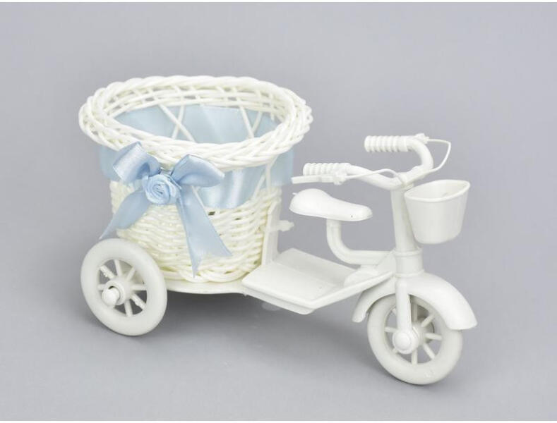 Virágtartó műanyag tricikli, műanyag fonott kosárral, selyem szalaggal, kis méretű növényekhez. Rendkívül egyszerűen dekorálhatjuk masnival, gyöngyökkel, szatén szalaggal. Kültéren és lakásban is elhelyezhető. Méret: 9x16cm, mag:8cm Átmérő:7cm