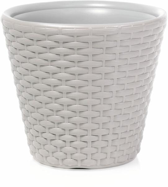 Rattan, fonott hatású, dekoratív, elegáns kaspó lakásba, irodába, teraszra. Erős, rugalmas műanyagból többféle színben és méretben. Műszaki adatok: Felső átmérő: 348 mm Magasság: 324 mm Űrtartalom: 19 l Szín: fehér Anyag: műanyag