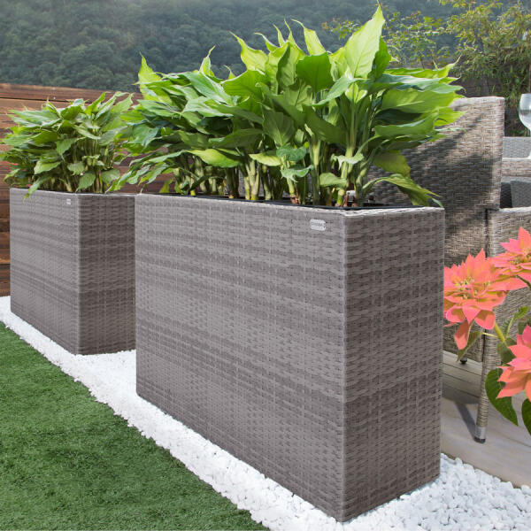 A négy részből álló virágcserép ideális a kertbe, erkélyre, lakásba vagy télikertbe ültetésre. A stílusos és praktikus virágcserép ellenáll az időjárási hatásoknak, az UV sugárzásnak, taszítja a szennyeződéseket, ezért ideális kültéri darab. A virágcserép könnyen karbantartható. A termék előnyei: 4 boxy Stílusos dizájn Kézzel szőtt polirattan háló Kivehet