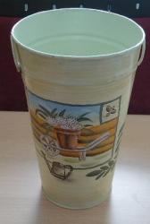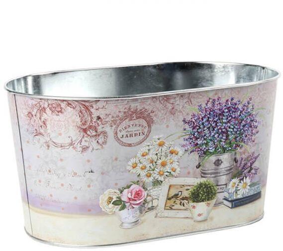 Dekoratív és hangulatos levendula - virágos mintájú ovális formájú bádog kaspó Jarden felirattal. Stílusosan virág, fűszernövény ültethető bele. Virágtartó mérete: 22,5x13,5 cm. A bádog kaspó bel- és kültéren egyaránt használható, mutatós virágtartó.