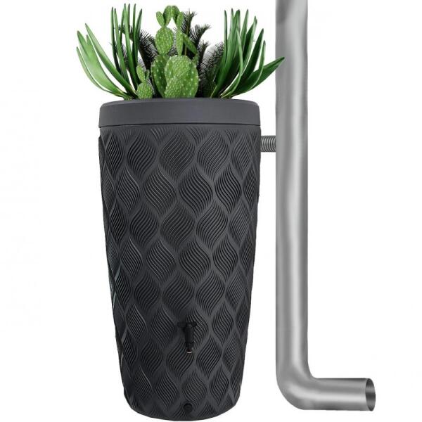 Antracit Esõvíztároló és esõvízgyűjtõ kaspó Uv stabil polietilén műanyagból gyártottesõvízgyűjtõ és tároló kaspó antracit szürke színben. Az esõvízgyűjtõ tartalmazza a fekete tömlõcsatlakozó kuplungos 3/4 colos csapot. A tartály falán ki van alakítva kettõ darab belsõmenetes kifolyónyílás, melyben tetszõlegesen lehet bekötni a kifolyócsapot. Amenyiben nem