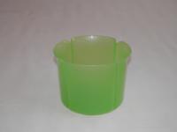 Átlátszó zöld színű, műanyag, szirom formájú virágtartó kaspó. Az átmérője 130 mm.
